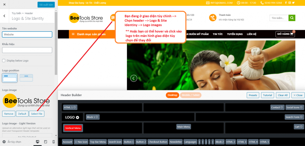Hướng dẫn quản trị website Wordpress Thay đổi logo trên trang web wordpress 20 Th3 Sau khi đăng nhập vào admin bạn tìm đến phần giao diện --> Chọn tùy biến.Khi đó giao diện sẽ xuất hiện dạng như sau Thêm menu trong website wordpress Thay đổi các thông tin chung: Hotline, Fanpage, Email, Địa chỉ công ty,….